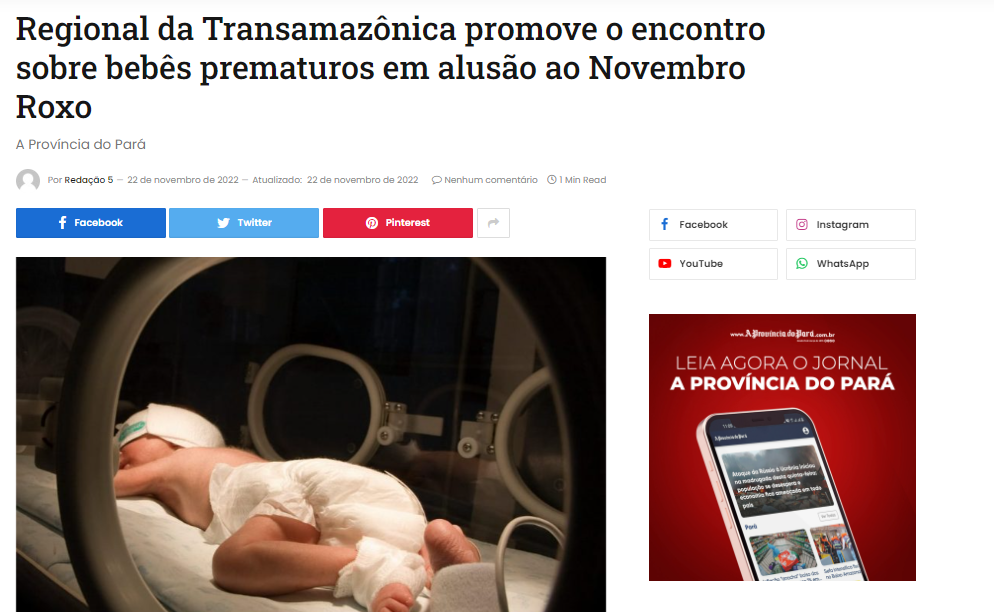 A Província do Pará – Regional da Transamazônica promove o encontro sobre bebês prematuros em alusão ao Novembro Roxo