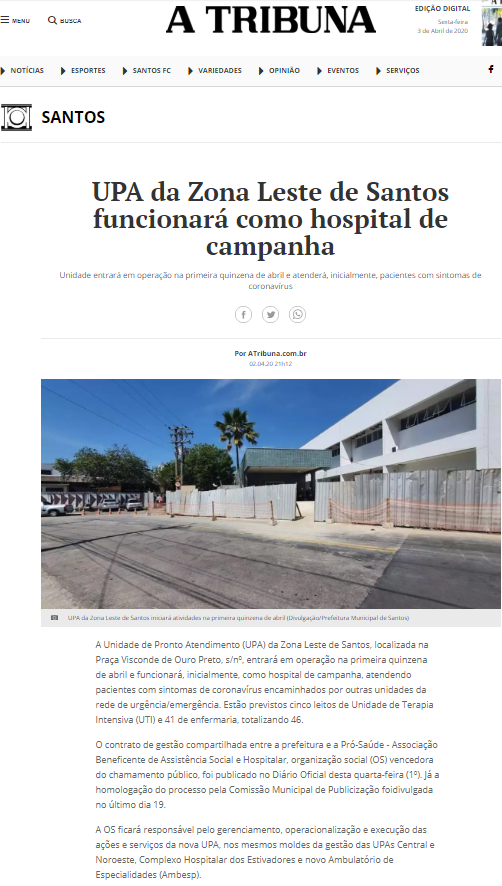 A Tribuna – UPA Zona Leste será inaugurada funcionando como hospital de campanha contra o coronavírus