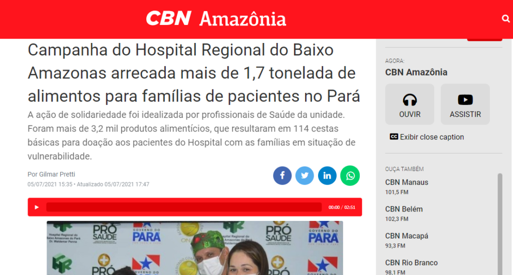 CBN Amazônia – Campanha do Hospital Regional do Baixo Amazonas arrecada mais de 1,7 toneladas de alimentos para famílias de pacientes no Pará