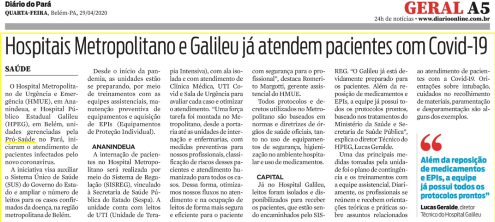 Diário do Pará – Hospitais Metropolitano e Galileu começam a atender pacientes com COVID-19