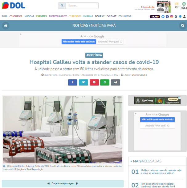 Diário do Pará Online – Com 60 leitos disponíveis, Hospital Galileu volta a atender casos de Covid-19