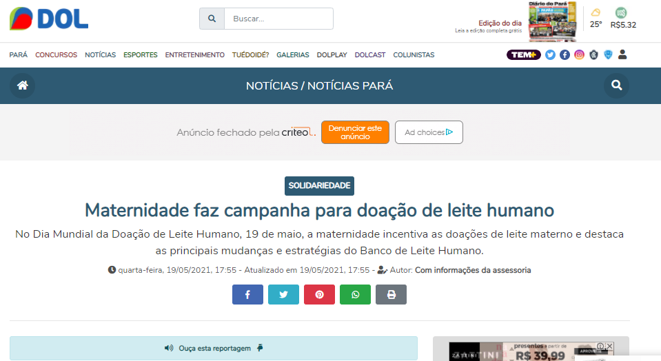 Diário do Pará Online – Hospital Materno-Infantil de Barcarena recebe doação de leite humano