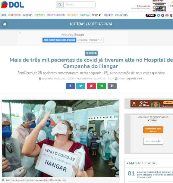 Diário do Pará Online – Mais de três mil pacientes com Covid-19 já tiveram alta no Hospital de Campanha do Hangar