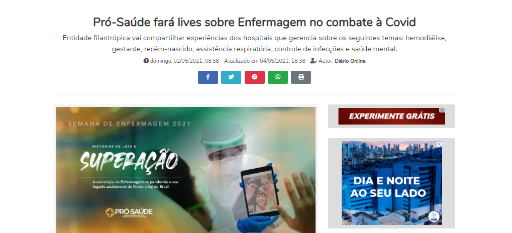 Diário do Pará Online – Pró-Saúde promove lives sobre atuação da Enfermagem no enfrentamento à Covid-19