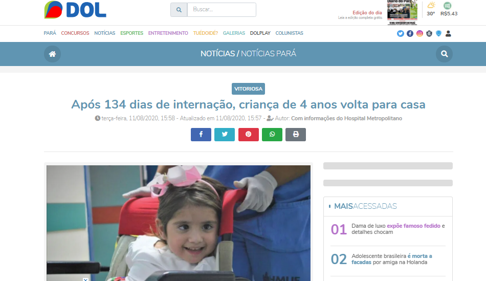 Diário Online – Após 134 dias de internação no Hospital Metropolitano, criança de 4 anos volta para casa no colo dos pais