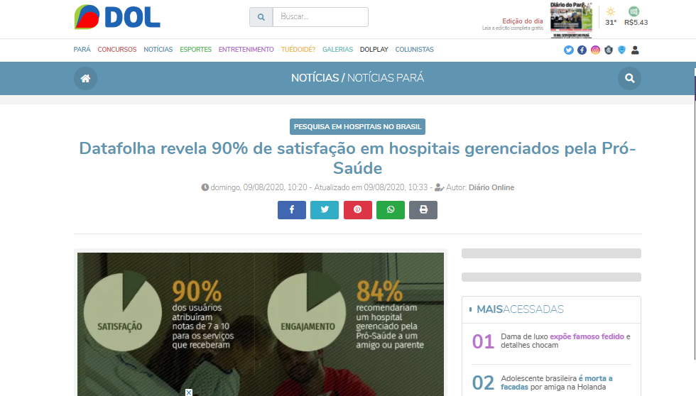 Diário Online – Datafolha revela 90% de satisfação em hospitais gerenciados pela Pró-saúde