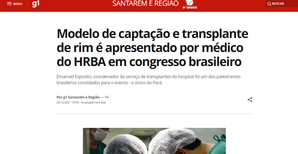G1 – Modelo de captação e transplante de rim é apresentado por médico do HRBA em congresso brasileiro