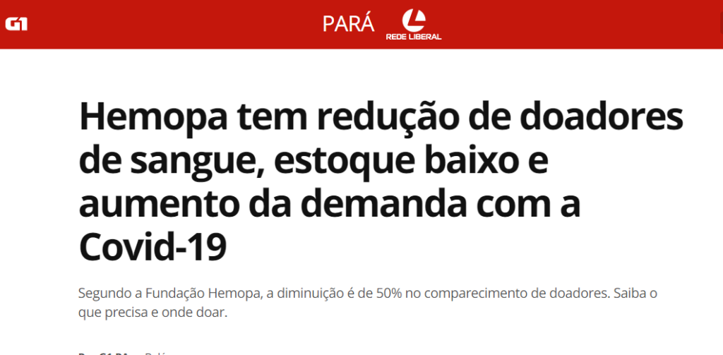 G1 Pará – 20% do sangue doado ao Hospital Regional do Sudeste do Pará é destinado para pacientes com Covid-19