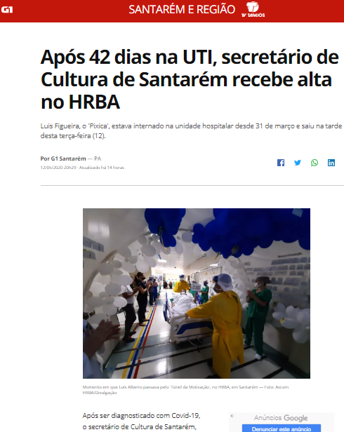 G1 Santarém e Região – Após 42 dias na UTI, paciente grave com covid-19 recebe alta no Hospital Regional do Baixo Amazonas.