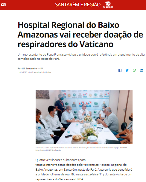 G1 Santarém e Região – Comitiva do Vaticano visita Hospital Regional do Baixo Amazonas e entregará novos respiradores para a UTI