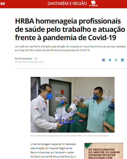 G1 Santarém e Região – Hospital Regional do Baixo Amazonas homenageia profissionais de saúde pelo trabalho durante três meses no combate à pandemia da Covid-19