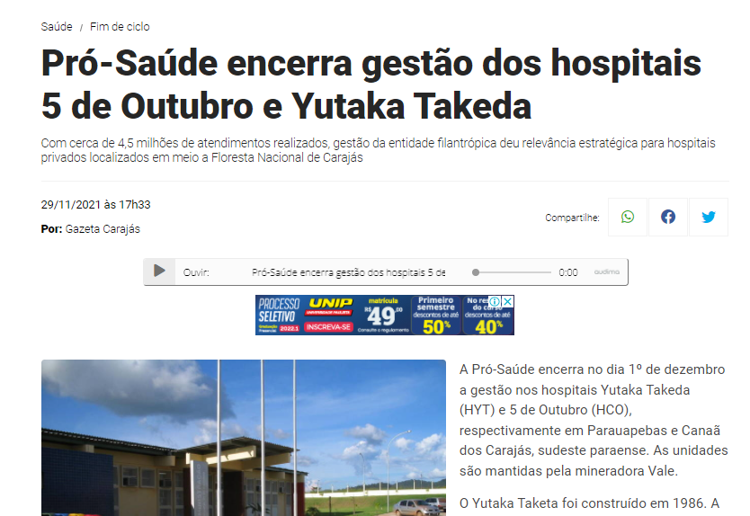 Gazeta Carajás – Pró-Saúde encerra gestão dos Hospitais Yutaka Takeda e 5 de Outubro