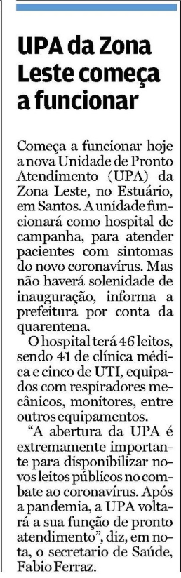 Jornal A Tribuna – Nova UPA Zona Leste é inaugurada como hospital de campanha