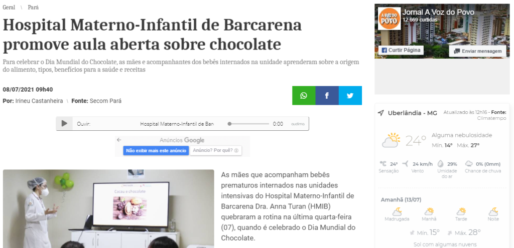 Jornal A Voz do Pará – Hospital Materno-Infantil de Barcarena promove aula aberta sobre chocolate