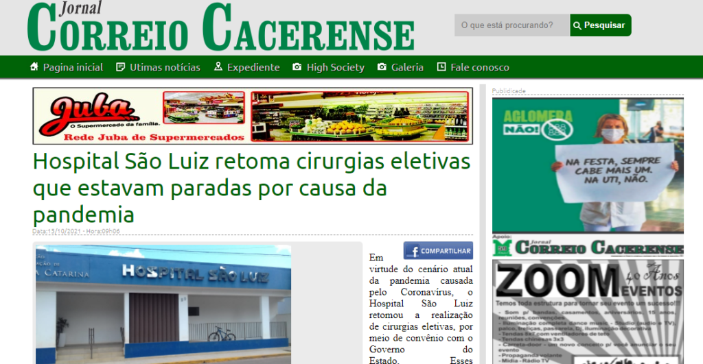 Jornal Correio Cacerense – Hospital São Luiz retoma cirurgias eletivas que estavam paradas por causa da pandemia
