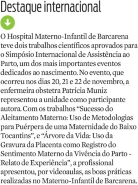 Jornal Diário do Pará – Hospital Materno-Infantil de Barcarena tem dois trabalhos científicos aprovados em evento internacional