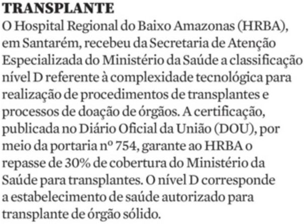 Jornal Diário do Pará – Hospital Regional do Baixo Amazonas é habilitado pelo Ministério da Saúde em programa que reconhece eficiência de transplantes