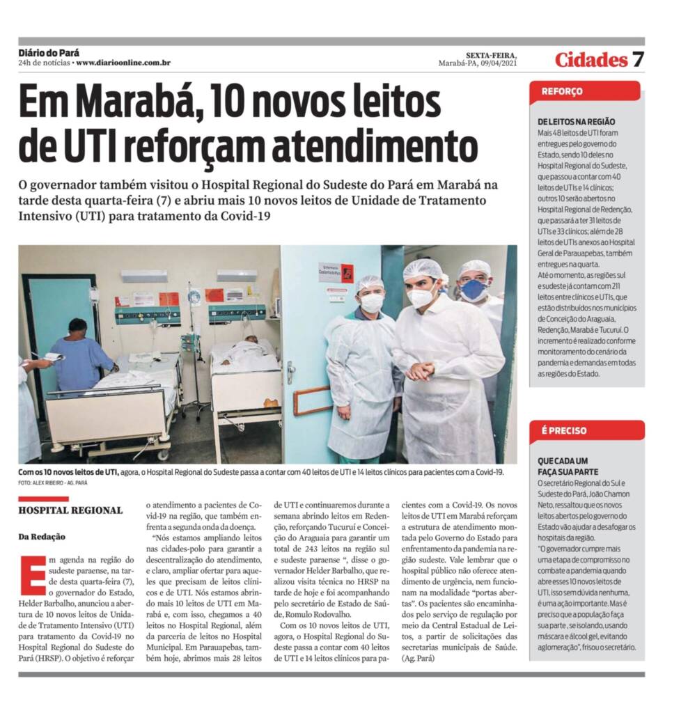 Jornal Diário do Pará – Hospital Regional do Sudeste do Pará abre 10 novos leitos de UTI exclusivos para Covid-19