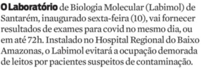 Jornal Diário do Pará – No Hospital Regional do Baixo Amazonas, laboratório fornecerá resultados de testes da Covid-19 em até 72 horas