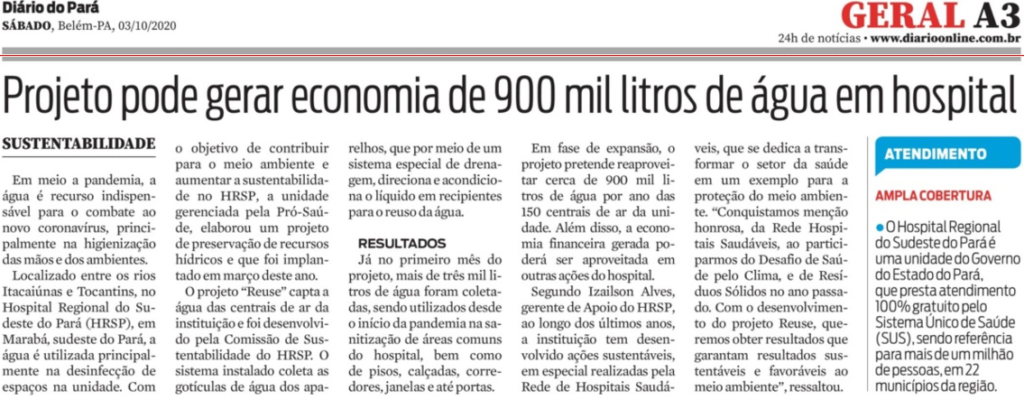 Jornal Diário do Pará – Projeto pode gerar economia de 900 mil litros de água no Hospital Regional do Sudeste do Pará