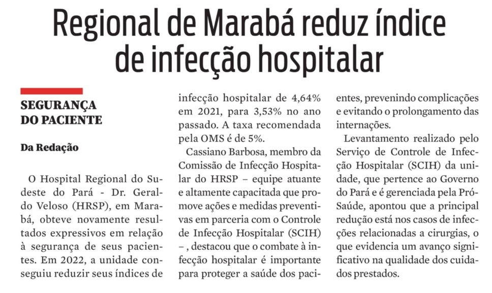 Jornal Diário do Pará – Regional de Marabá reduz índice de infecções hospitalar