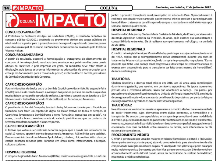 Jornal O Impacto Impresso – Transplante renal no HRBA