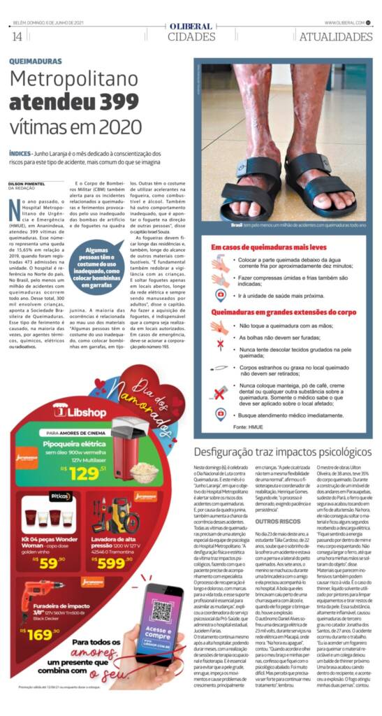 Jornal O Liberal – Hospital Metropolitano atendeu 399 vítimas de queimaduras em 2020