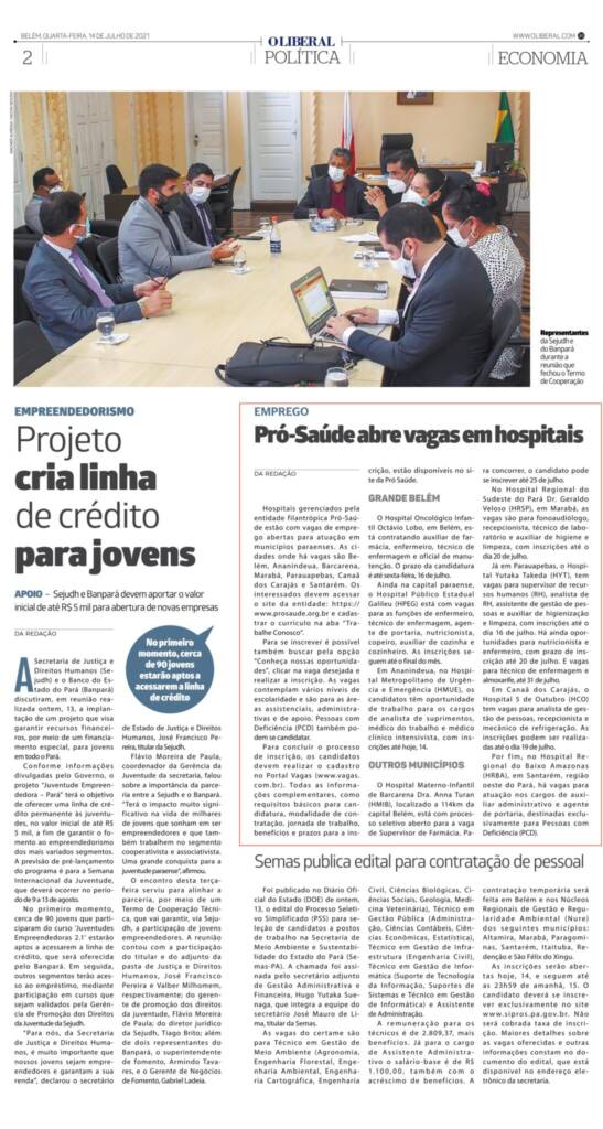 Jornal O Liberal – Pró-Saúde abre vagas em hospitais