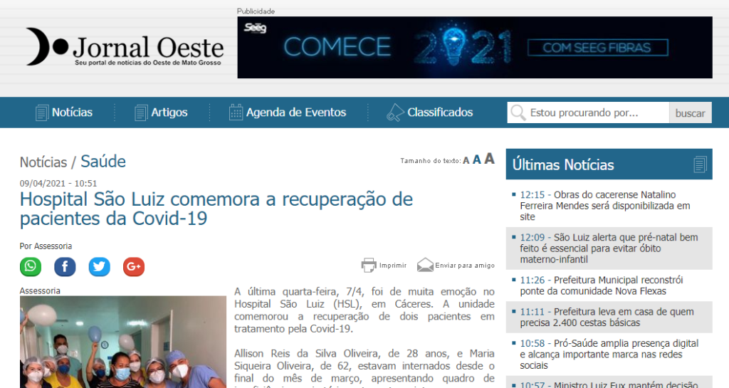 Jornal Oeste – Hospital São Luiz comemora a recuperação de dois pacientes com insuficiência respiratória por conta da Covid-19