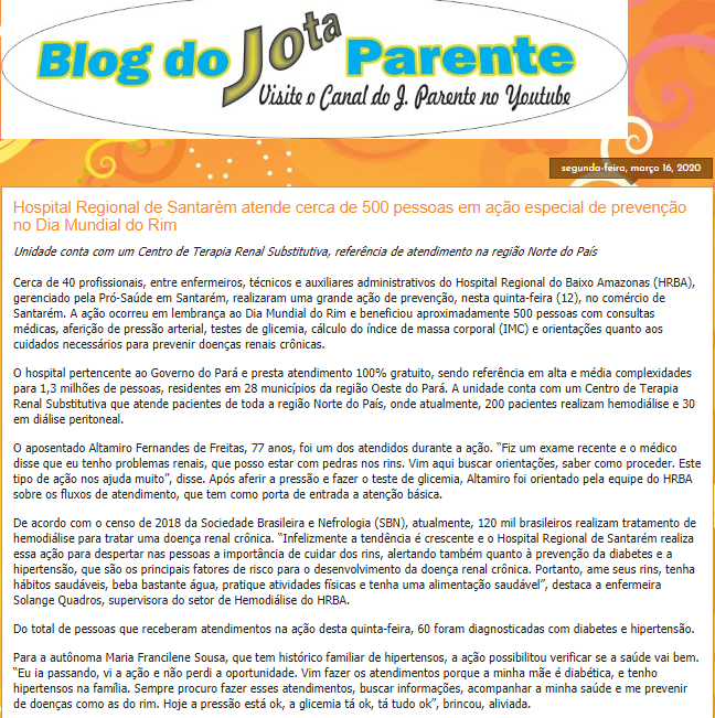 Jota Parente – Hospital Regional do Baixo Amazonas atende cerca de 500 pessoas no Dia Mundial do Rim