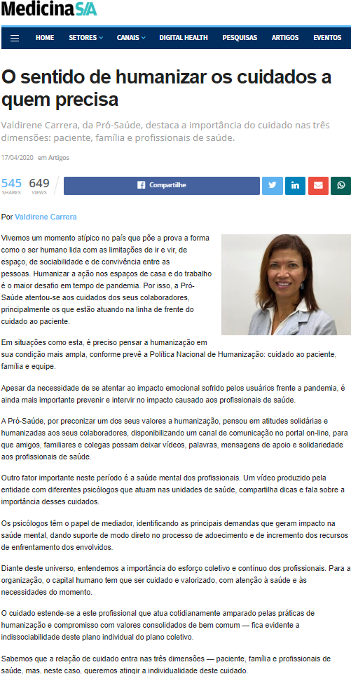 Medicina S/A – Coordenadora de Filantropia da Pró-Saúde reforça a importância da humanização no cuidado ao próximo durante a pandemia
