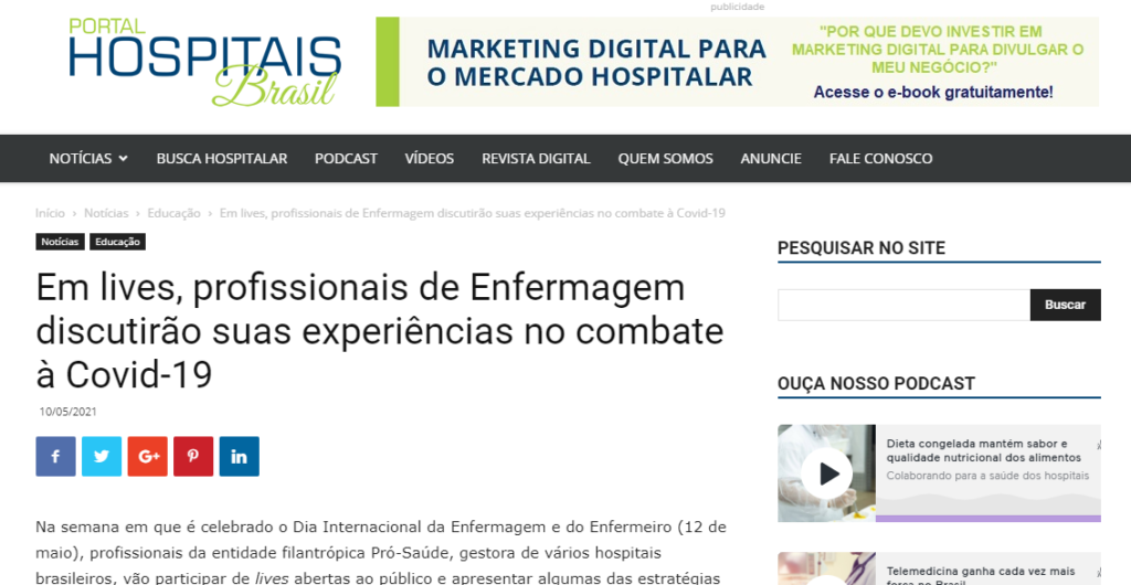 Portal Hospitais Brasil – Em lives, profissionais de enfermagem da Pró-Saúde discutirão suas experiências no combate à Covid-19