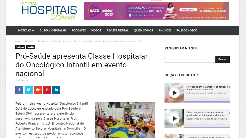 Portal Hospitais Brasil – Pró-Saúde apresenta Classe Hospitalar do Oncológico Infantil em evento nacional