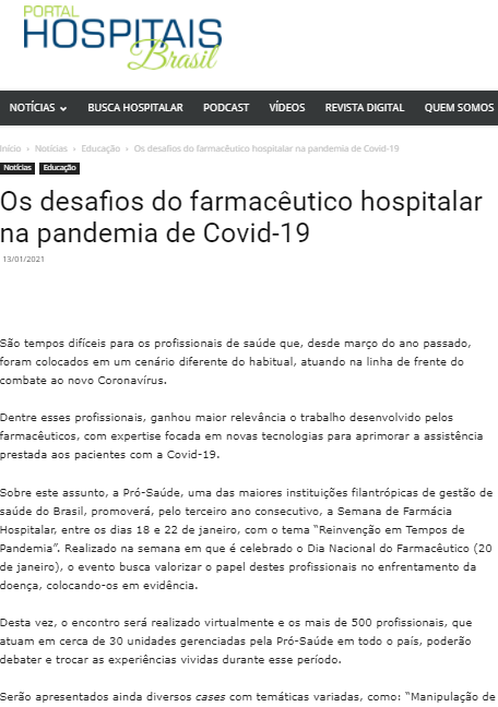 Portal Hospitais Brasil – Pró-Saúde debate desafios do farmacêutico hospitalar na pandemia de Covid-19