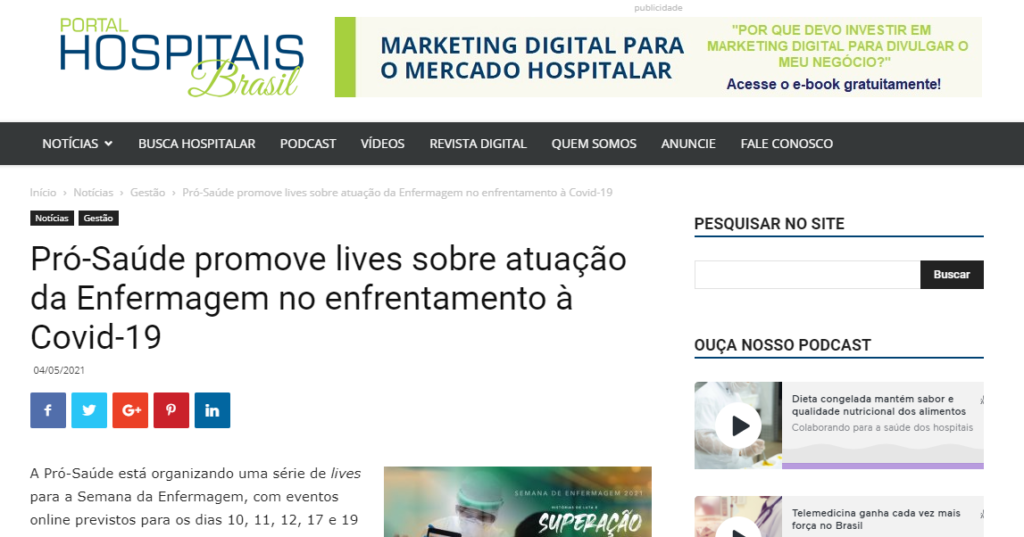Portal Hospitais Brasil – Pró-Saúde promove lives sobre atuação da enfermagem no enfrentamento da Covid-19