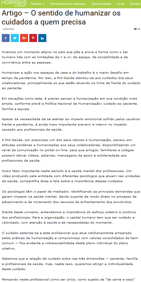 Portal Hospitais do Brasil – Coordenadora de Filantropia da Pró-Saúde reforça a importância da humanização no cuidado ao próximo durante a pandemia