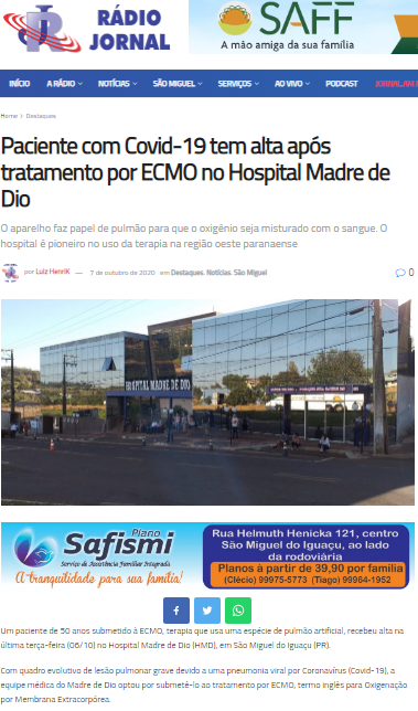 Rádio Jornal São Miguel -C Paciente com covid-19 tem alta no Hospital Madre de Dio após tratamento pioneiro na região