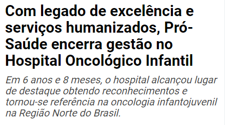 Rede Pará – Com legado de excelência e serviços humanizados, Pró-Saúde encerra gestão no Hospital Oncológico Infantil