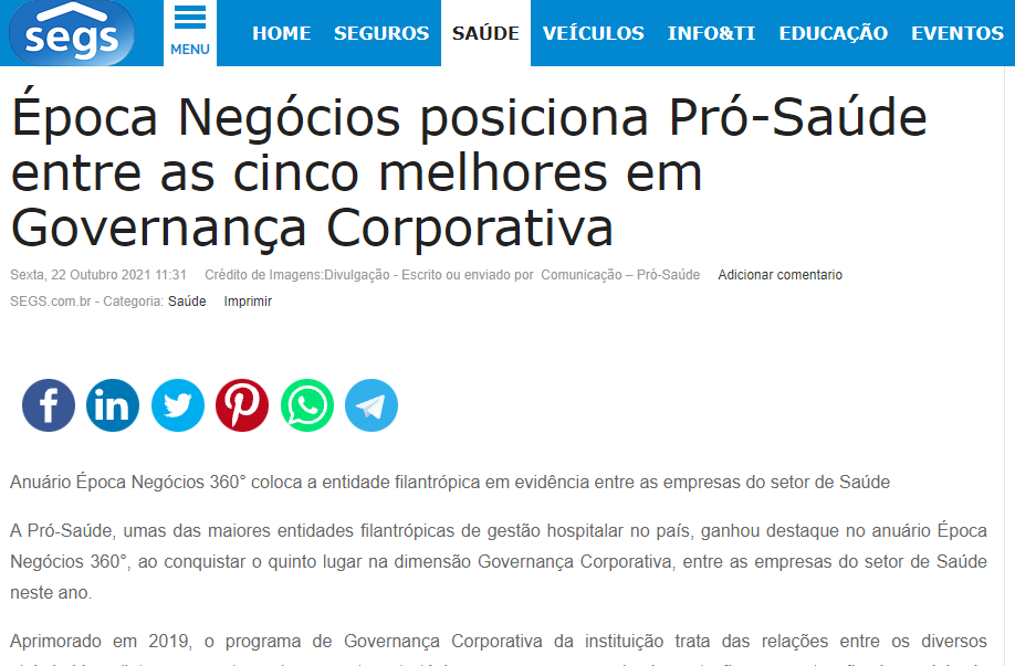 Segs – Época Negócios posiciona Pró-Saúde entre cinco melhores em Governança Corporativa
