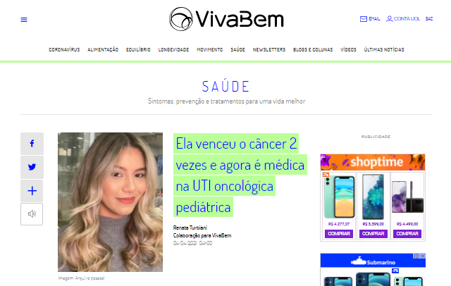 UOL – Viva Bem – Jovem que superou o câncer duas vezes atua como médica na UTI do Hospital Oncológico Infantil