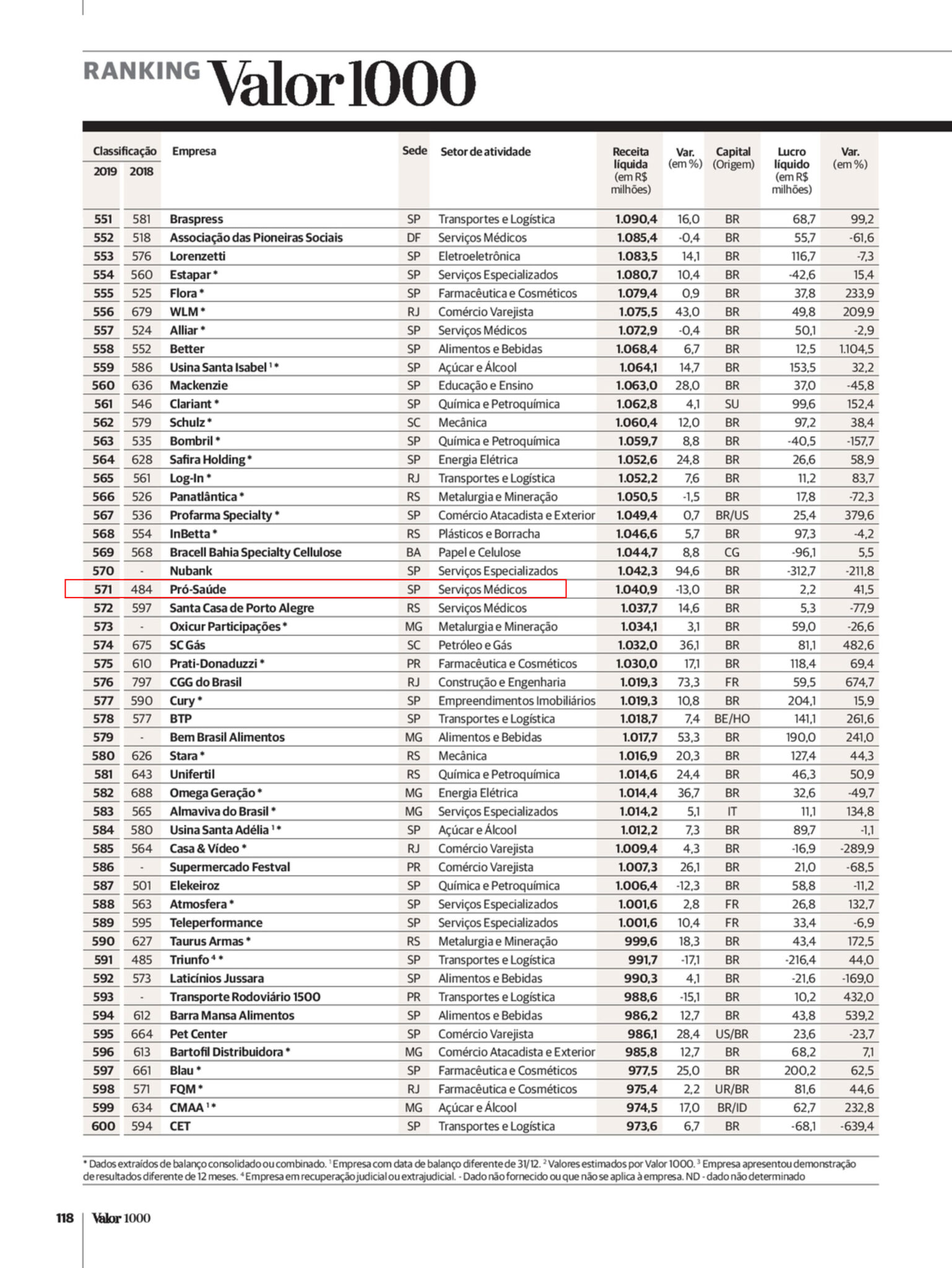 Valor Econômico – Ranking Valor 1000 – Pró-Saúde está entre as 600 maiores instituições do Brasil