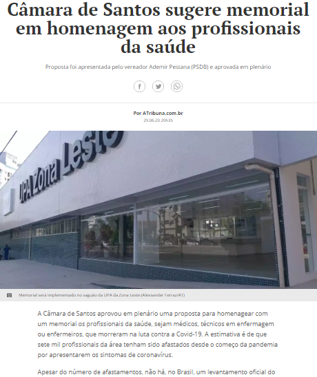 A Tribuna – Vereadores de Santos sugerem memorial na UPA Zona Leste em homenagem aos profissionais da saúde