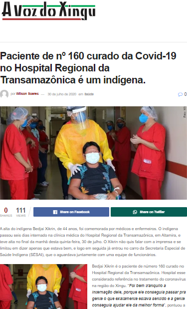A Voz do Xingu – Indígena é o 160° paciente recuperado da Covid-19 no Hospital Regional da Transamazônica