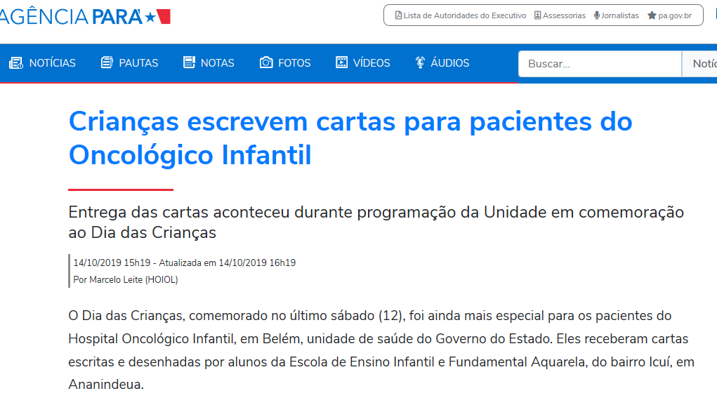 Agência Pará – Pacientes do Hospital Oncológico Infantil recebem cartas de outras crianças em comemoração do dia das crianças