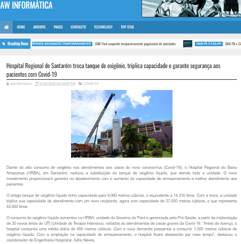 Aw Informática – Hospital Regional de Santarém troca tanque de oxigênio, triplica capacidade e garante segurança aos pacientes com Covid-19