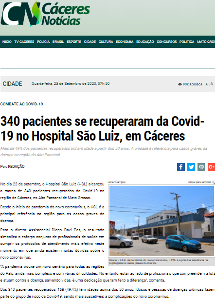Cáceres Notícias – 340 pacientes se recuperaram da Covid-19 no Hospital São Luiz