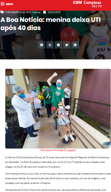 CBN Campinas – Menina de 10 anos vence a covid-19 após 40 dias internada na UTI do Hospital Regional do Baixo Amazonas e reencontra família