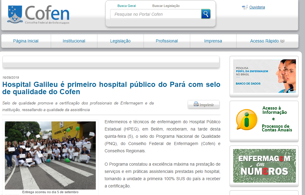 Cofen – Hospital Galileu é primeiro hospital público do Pará com selo de qualidade do Cofen