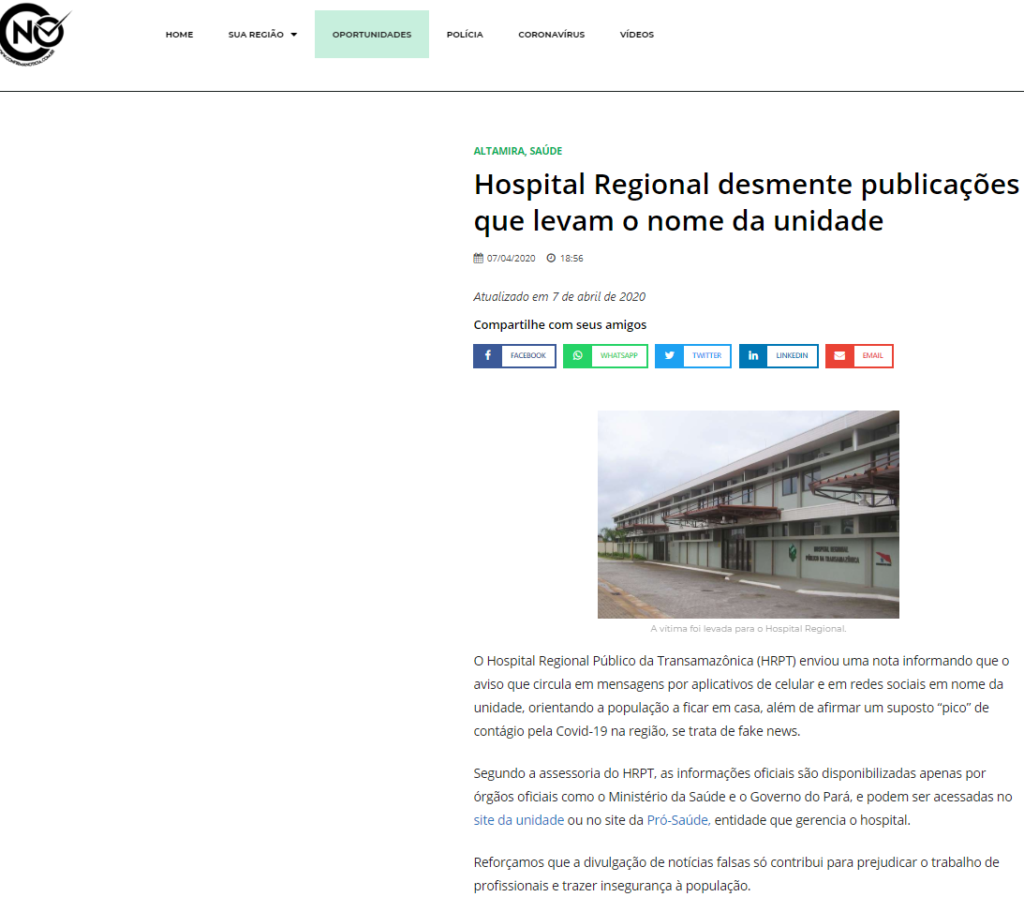Confirma Notícias – Hospital Regional da Transamazônica desmente fake news espalhadas com o nome da unidade