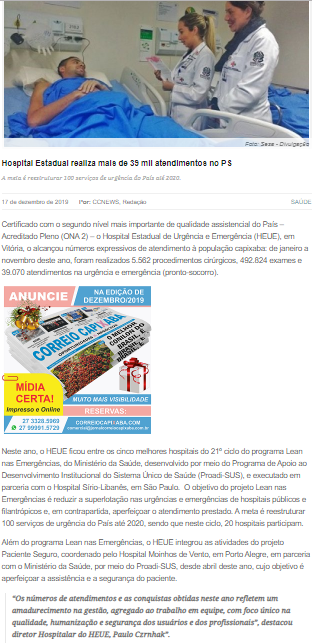 Correio Capixaba – Hospital Estadual de Urgência e Emergência realiza mais de 39 mil atendimentos no Pronto-Socorro em 2019